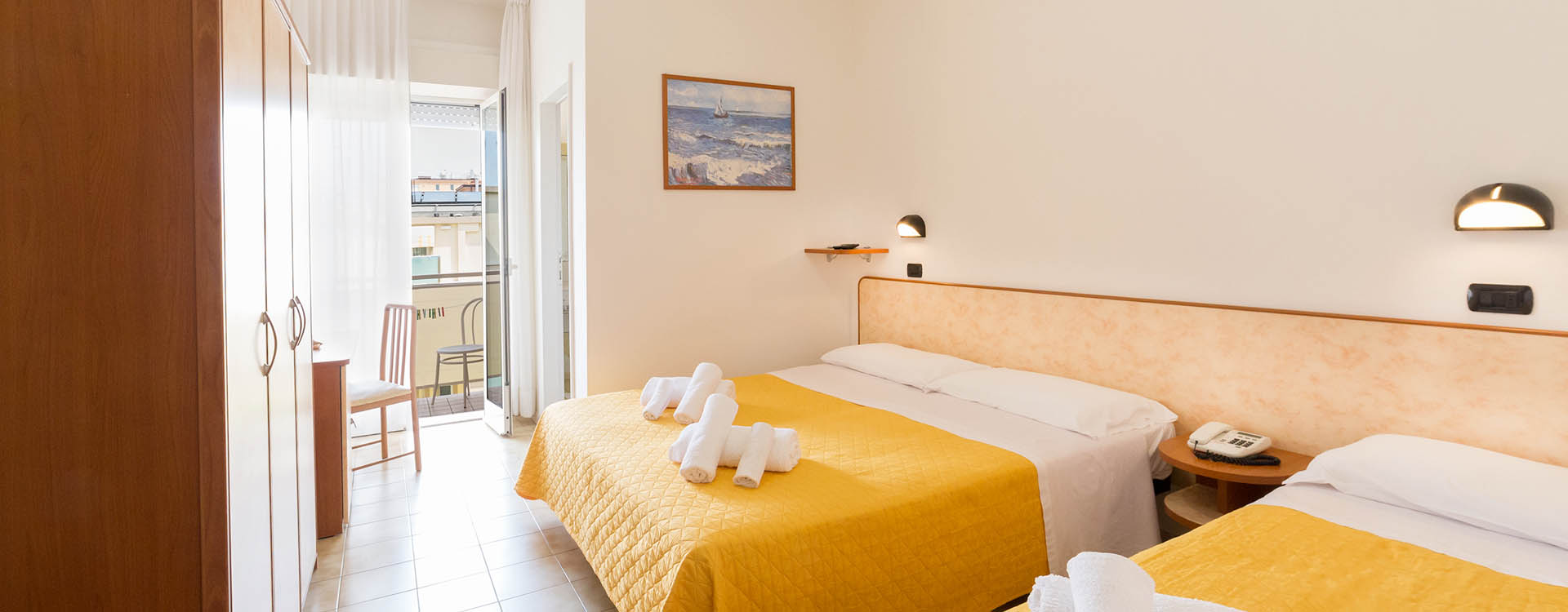 Le type Family, idéal pour les familles avec enfants, se compose d'une belle et spacieuse chambre double et d'une chambre avec deux lits superposés, toutes deux avec balcon, séparées par une porte de séparation intérieure.